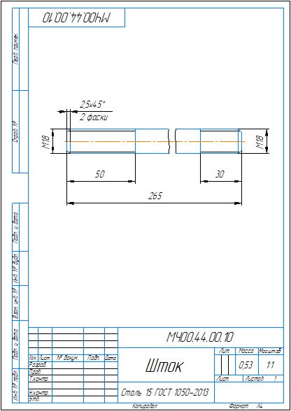 Рабочий чертеж детали шток МЧ00.44.00.10 в компасе из сборки МЧ00.44.00.00 альбома по деталированию Боголюбова