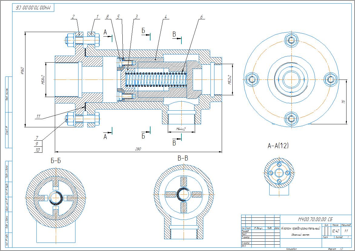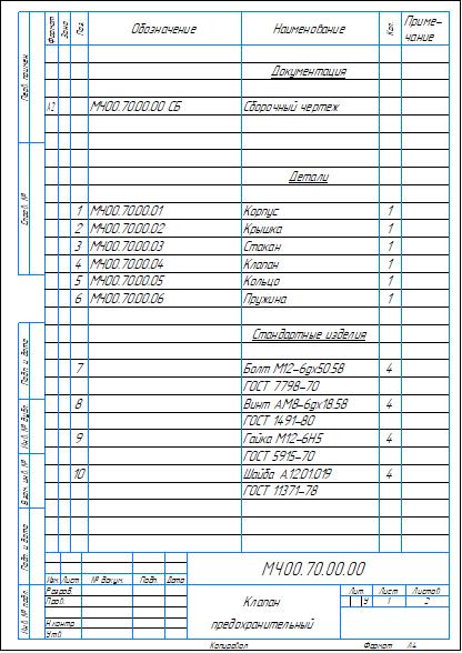 Сборочный чертеж и спецификация сборки клапан предохранительный МЧ00.70.00.00 из альбома по деталированию Боголюбова. Чертеж и спецификация выполнены в компасе