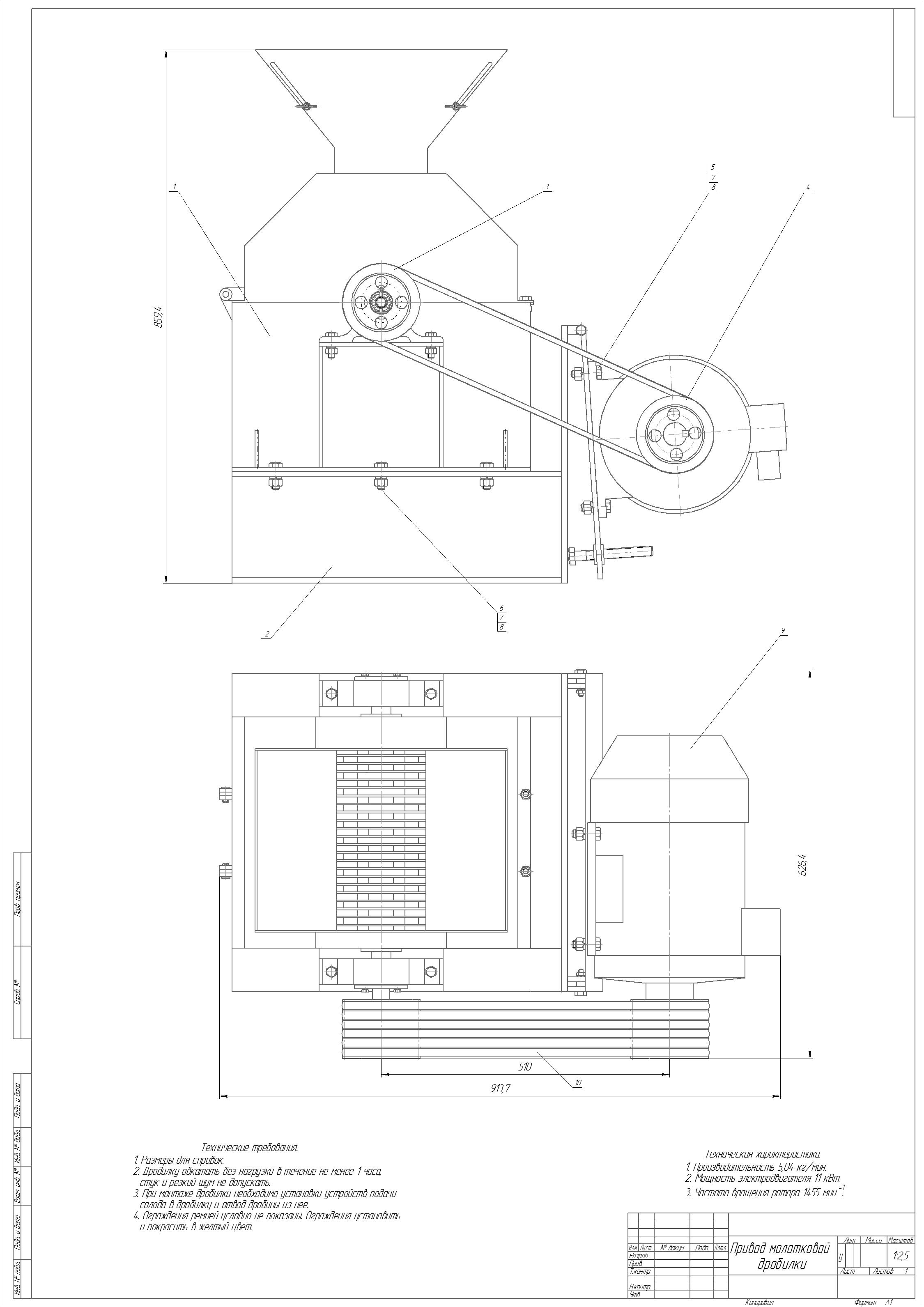 Привод молотковой дробилки будет производится при помощи клиноременной передачи. Данное решение позволит болеее рационально разместить двигатель относитнельно дробилки. Из условия задания передаваемая мощность молотковой дробилки равна 7кВТ. Выбираем двигатель RAM132М4 с номинальной мощностью 7,5 кВт и частотой вращения 1455〖мин〗^(-1).