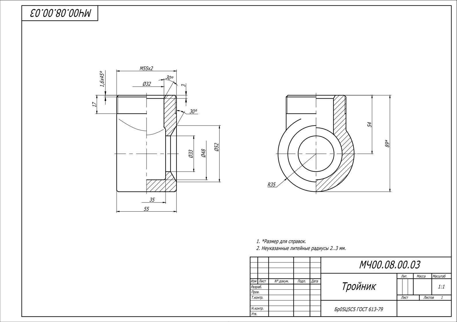 Рабочий чертеж детали тройник МЧ00.08.00.03 в AutoCAD из сборки МЧ00.08.00.00 альбома по деталированию Боголюбова