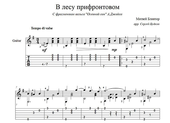 Аранжировка для гитары военной песни "В лесу прифронтовом" композитора Матвея Блантера. В середине звучит фрагмент вальса "Осенний сон" А. Джойса.