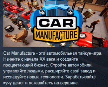 Car Manufacture — это игра о создании и управлении автомобильным заводом в начале XX века. Имея всего несколько тысяч долларов, у вас будет возможность построить и развивать собственный завод, проектируя каждый аспект его работы. Начните с строительства зданий и организации первой производственной линии. Нанимайте сотрудников и обучайте их, чтобы обеспечить высокий уровень навыков.