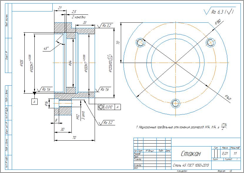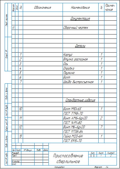 Сборочный чертеж и спецификация приспособления сверлильного делительного для обработки отверстий в детали стакан. Также приложен чертеж обрабатываемой детали - стакан. Чертежи и спецификация выполнены в компасе
