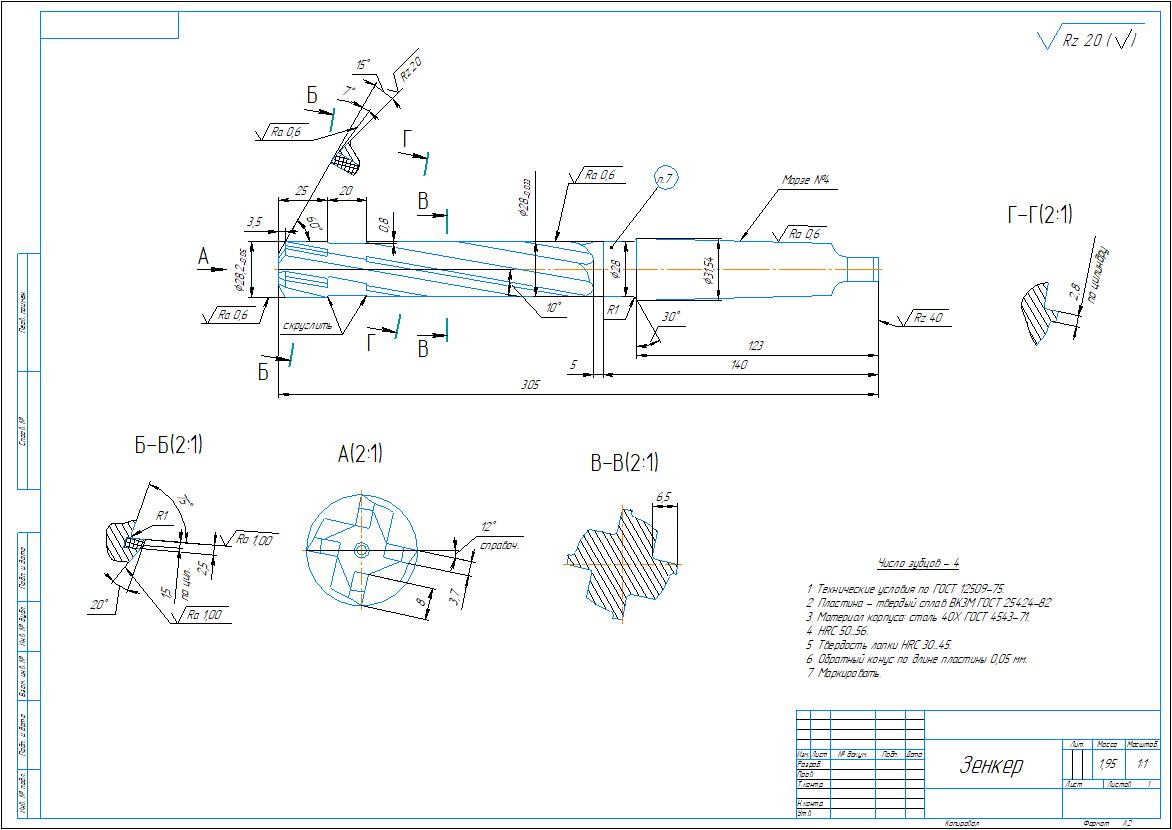 Рабочий чертеж зенкера с твердосплавными пластинками для обработки отверстий диаметром 28,2 мм. Чертеж выполнен в компасе.