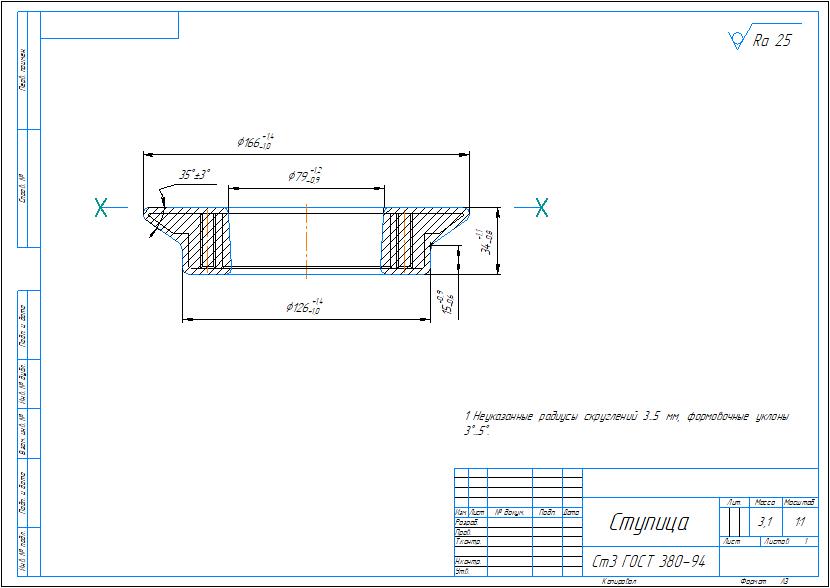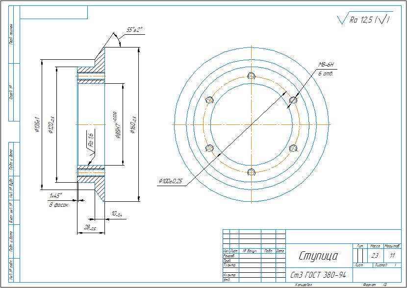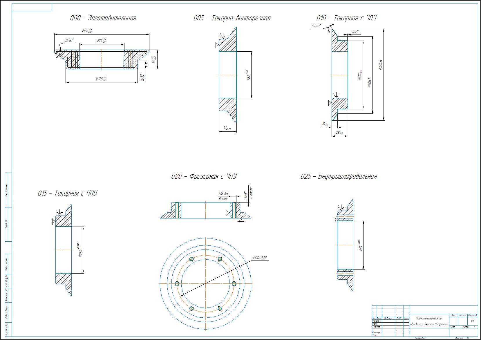 Технологический процесс обработки детали ступица в виде маршрута обработки на листе А1. Также приложены рабочий чертеж детали ступица и чертеж заготовки. Все чертежи выполнены в компасе.