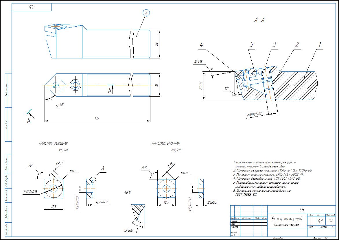 Сборочный чертеж и спецификация на резец токарный прямой проходной сборный с пластинкой из твердого сплава в компасе