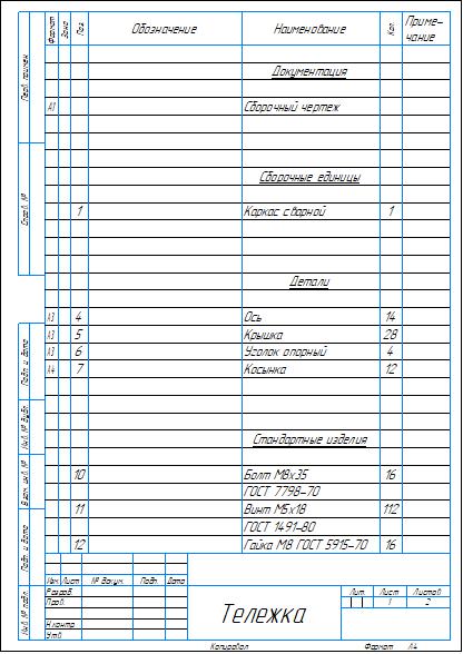 Тележка для перевозки аккумуляторов. Сборочный чертеж, спецификация и деталировка в компасе.