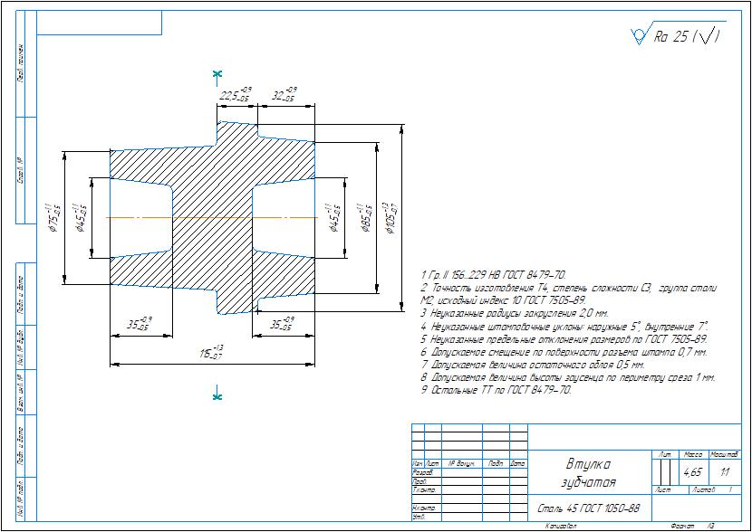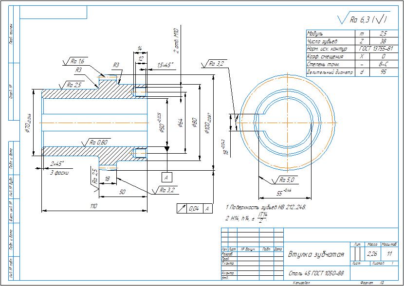 Рабочий чертеж детали втулка зубчатая и чертеж ее заготовки в компасе. Втулка зубчатая является составной частью муфты зубчатой, устанавливаемой на вал.