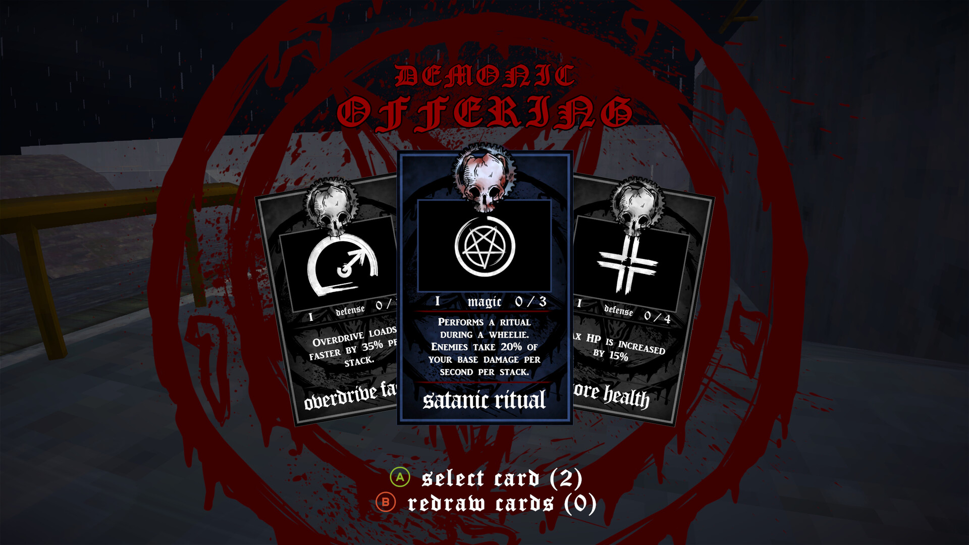 Демонические дары приходят в виде карт. Соберите свою колоду, выбирая подходящие карты. Разблокируйте новые карты для последующих прохождений игры, чтобы быть готовым к ужасам, которые может предложить Motördoom.