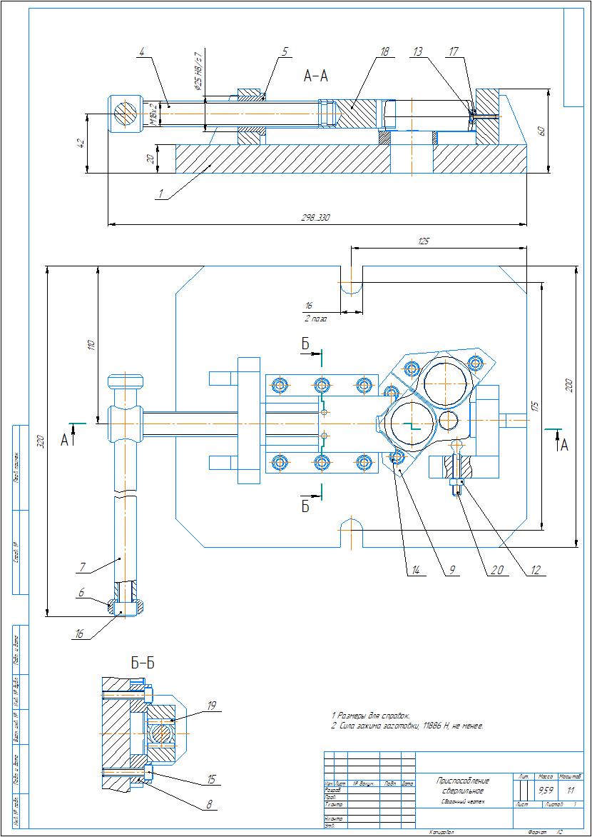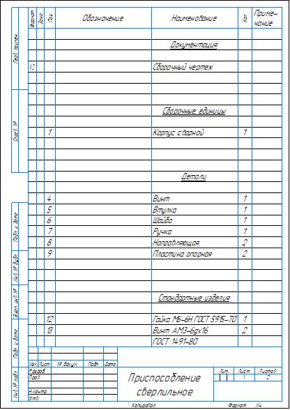 Сборочный чертеж и спецификация сверлильного приспособления для обработки детали оправа в компасе. Также приложен рабочий чертеж детали оправа.