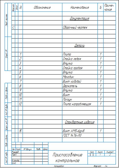 Сборочный чертеж и спецификация контрольно-измерительного приспособления для контроля биения шеек распределительного вала в компасе. Также приложены чертежи некоторых деталей приспособления.
