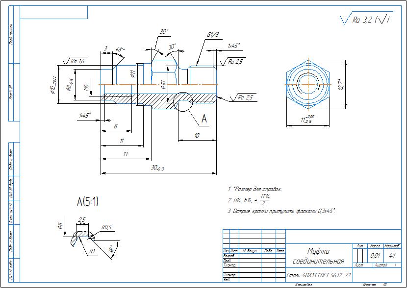 Чертежи технологических наладок на обработку детали муфта соединительная в компасе. Представлены токарные с ЧПУ наладки, фрезерная наладка. Также приложен рабочий чертеж детали в компасе
