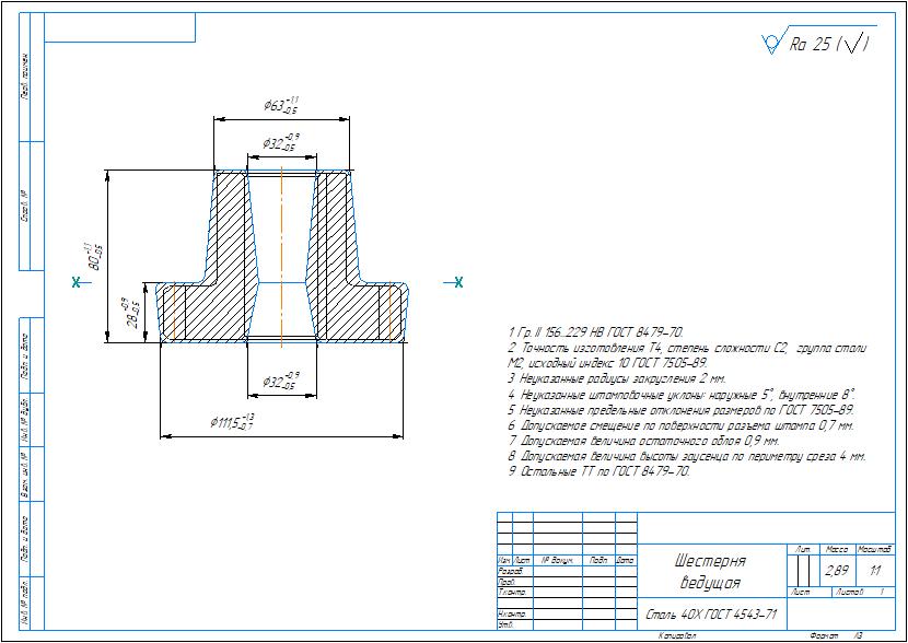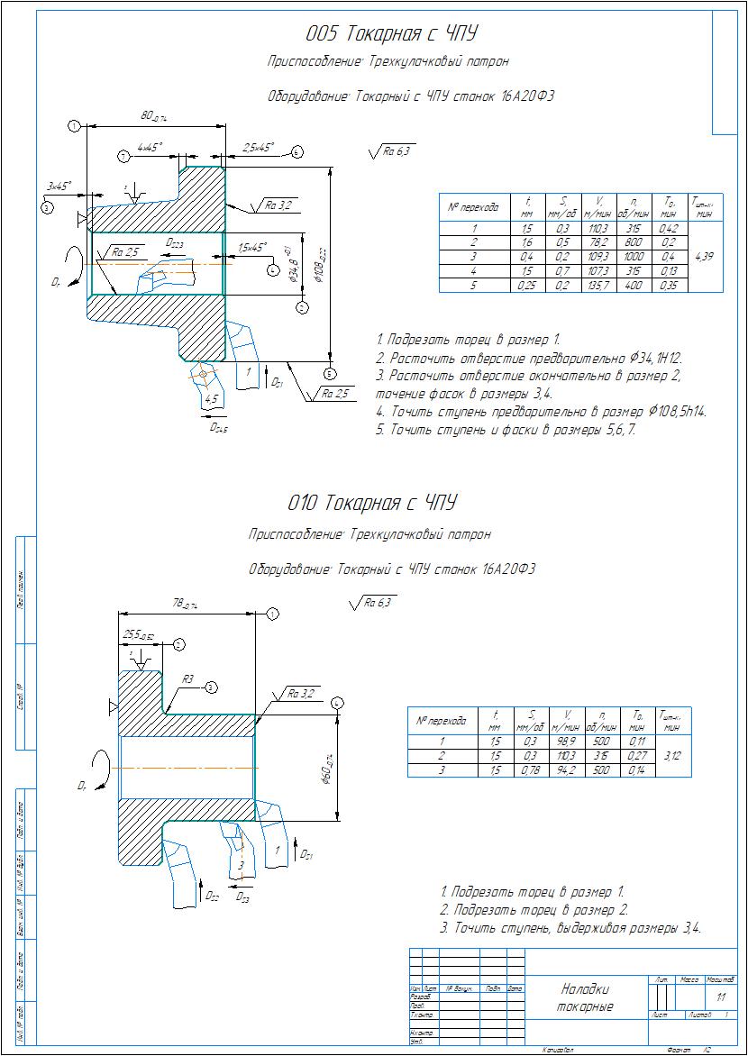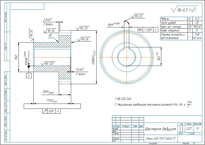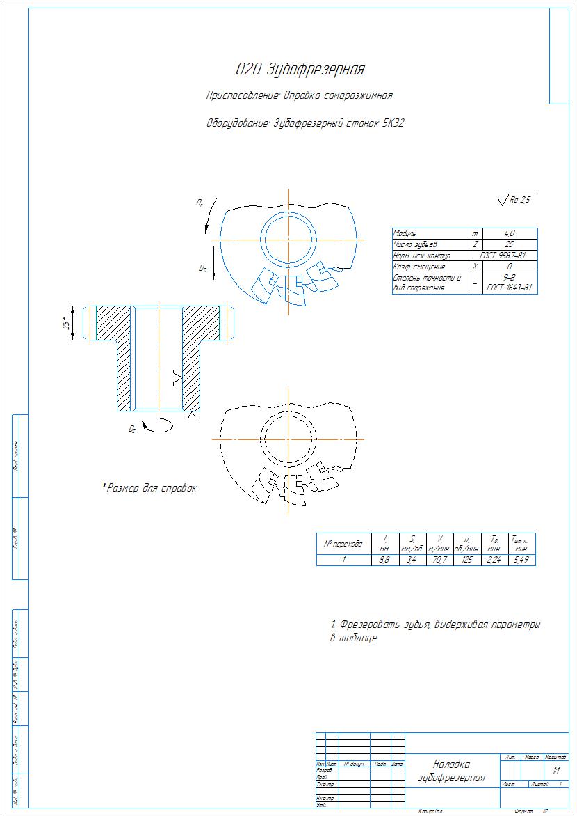 Чертежи зубофрезерной и токарной с ЧПУ наладок при механической обработке детали шестерня ведущая в компасе. Также приложены рабочий чертеж детали шестерня ведущая и заготовка.