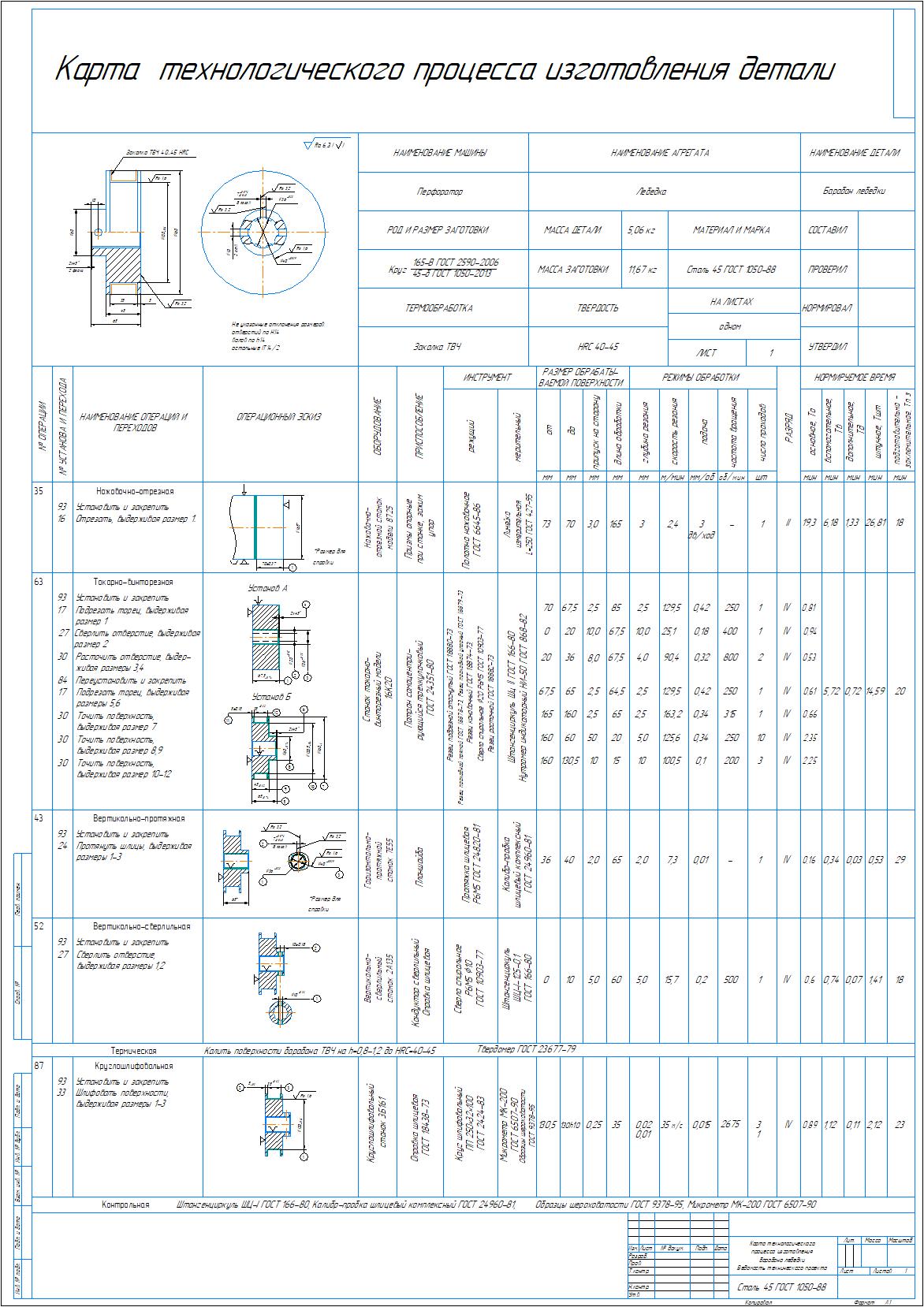 Карта технологического процесса изготовления детали барабан лебедки в компасе. Карта выполнена на формате А1. В ней представлен чертеж детали, технологические операции и переходы, операционные эскизы, режимы резания, нормы времени, режущий и измерительный инструмент, станки и приспособления.
