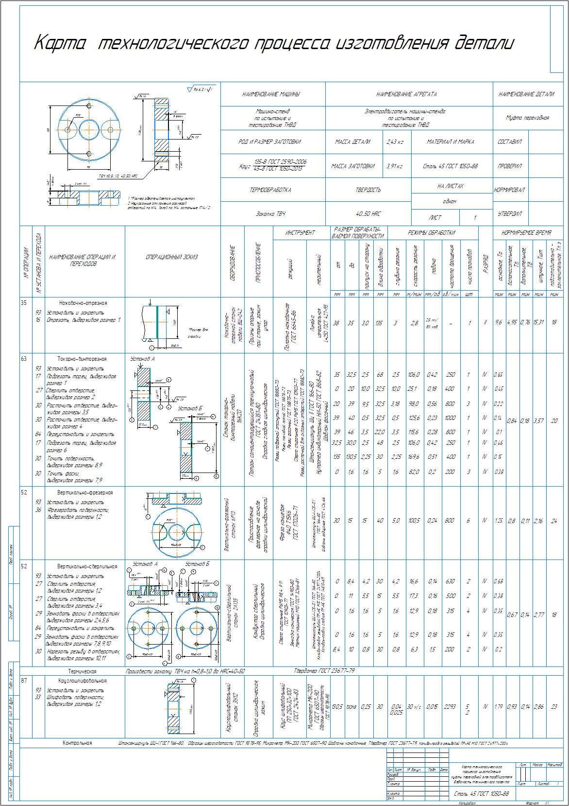 Карта технологического процесса изготовления детали муфта переходная электродвигателя в компасе. Карта выполнена на формате А1. В ней представлен чертеж детали, технологические операции и переходы, операционные эскизы, режимы резания, нормы времени, режущий и измерительный инструмент, станки и приспособления.