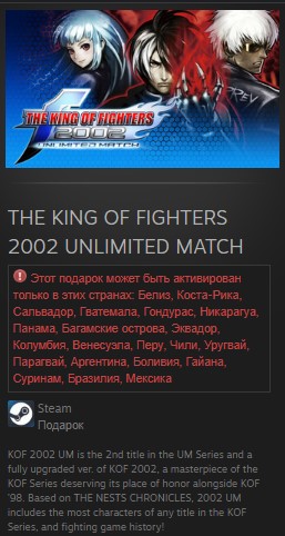 KOF 2002 UM — вторая игра в серии UM и полностью улучшенная версия KOF 2002, шедевр серии KOF, заслуживающий своего почетного места рядом с KOF ’98. Основанная на THE NESTS CHRONICLES, 2002 UM включает в себя наибольшее количество персонажей из любой игры серии KOF и историю файтингов!