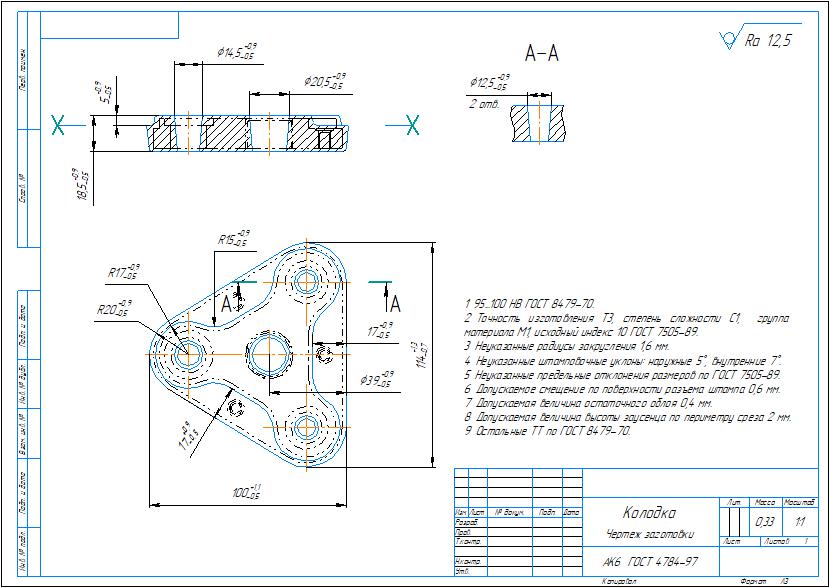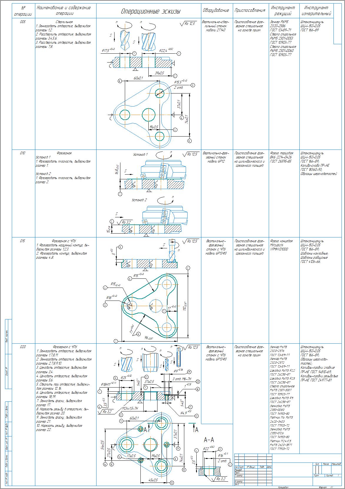 Технологический процесс изготовления детали колодка в виде плаката на формате А1 с указанием операций, переходов, операционных эскизов, оборудования, приспособлений, инструментов для механической обработки детали колодка. Также приложены рабочий чертеж детали колодка и чертеж заготовки. Чертежи выполнены в компасе.