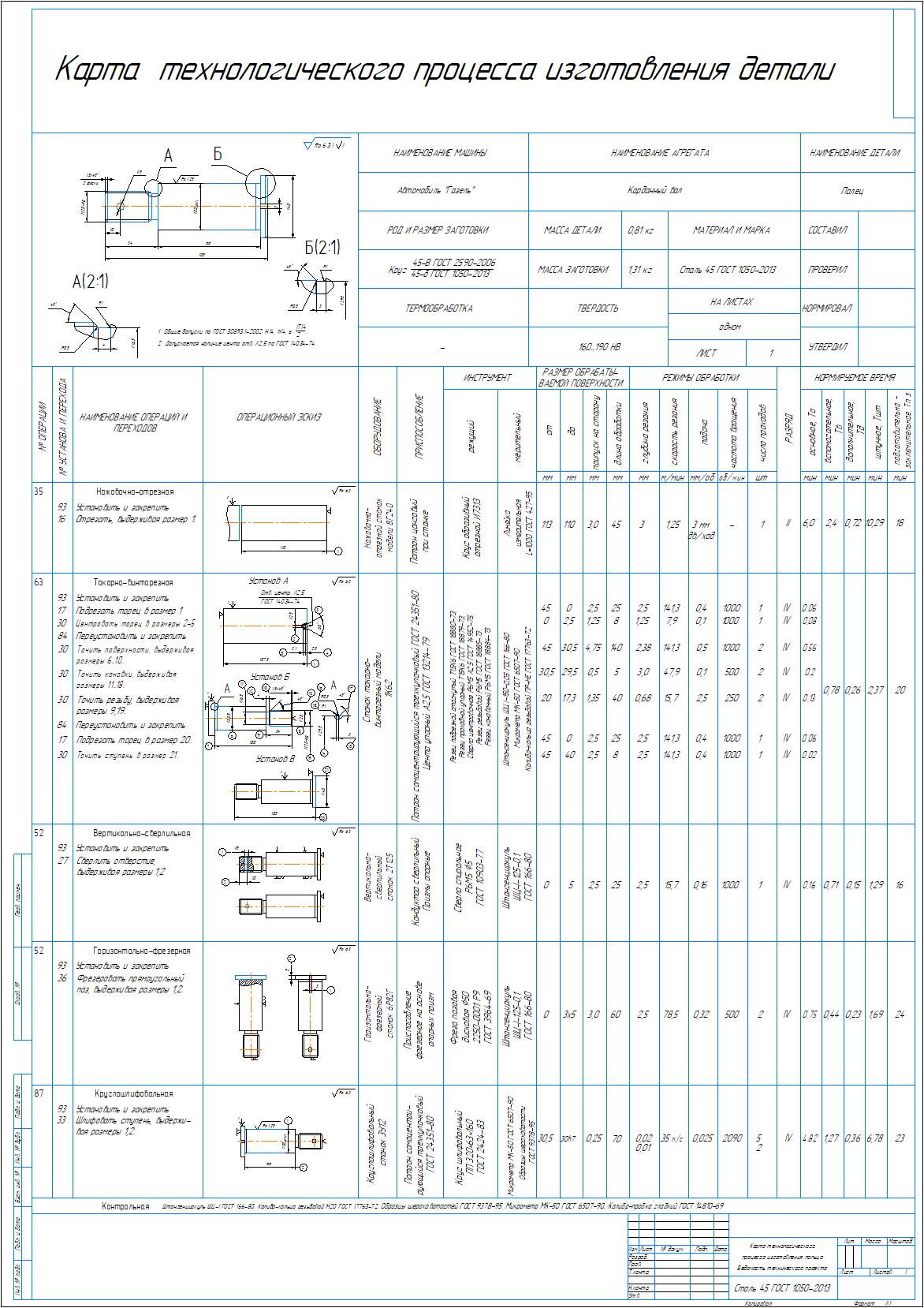 Технологическая карта изготовления детали палец в виде чертежа на формате А1, где представлен рабочий чертеж детали, перечень операций, переходов, операционные эскизы, оборудование, оснастка, режущий и измерительный инструменты, режимы резания и нормы времени по операциям. Чертеж выполнен в компасе.