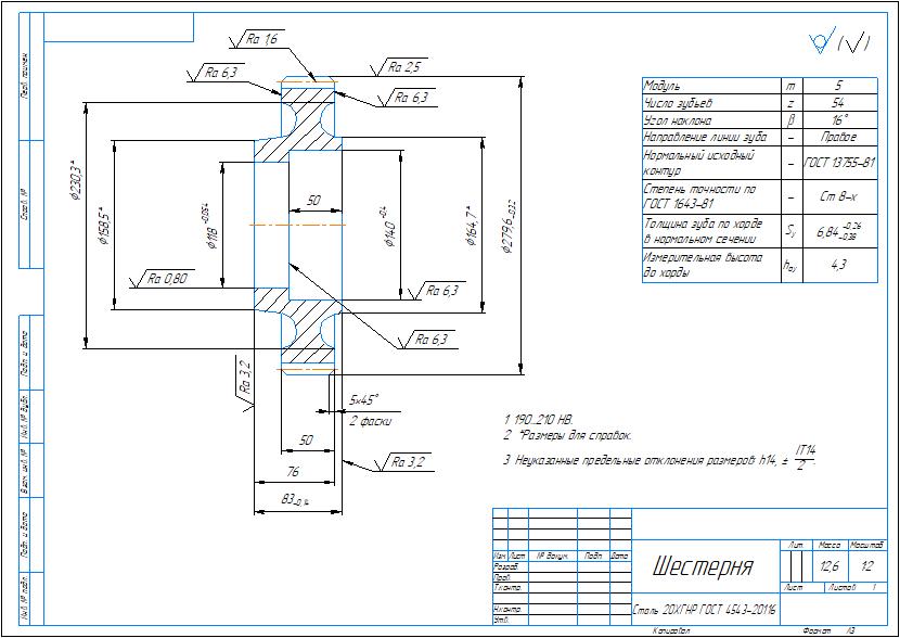 Рабочий чертеж детали шестерня косозубая в компасе. Параметры зубчатого венца: модуль m=5 мм, число зубьев 54 шт., угол наклона зубчатого венца - 16 градусов.