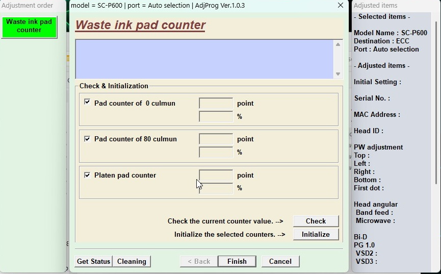 8.В нашем случае переполнен счетчик Main pad counter, что бы его сбросить, ставим возле него галочку и нажимаем кнопку Initialize, мы сбросим оба счетчика. Прошу обратить внимание на такой момент: если в очереди печати остались не напечатанные задания, то программа может зависнуть, поэтому не забудьте очистить очередь печати, в некоторых случаях, стоит перезагрузить компьютер