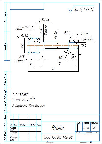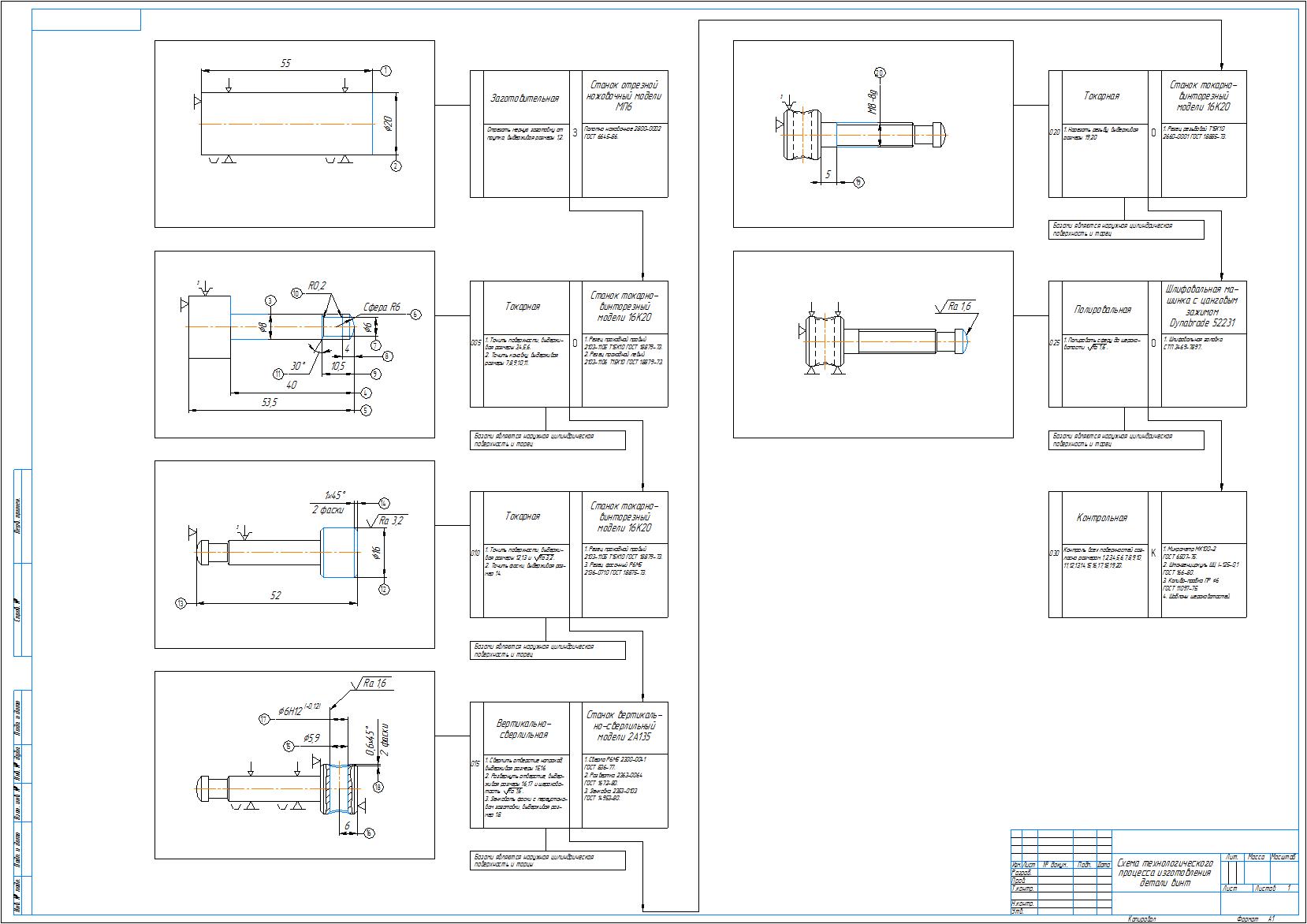 Технологический процесс изготовления детали винт в виде маршрутно-операционных карт и карт эскизов. Также приложены рабочий чертеж детали винт и схема технологического процесса изготовления детали винт. Чертежи выполнены в компасе, карты в ворде.