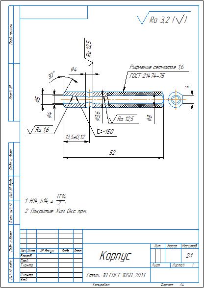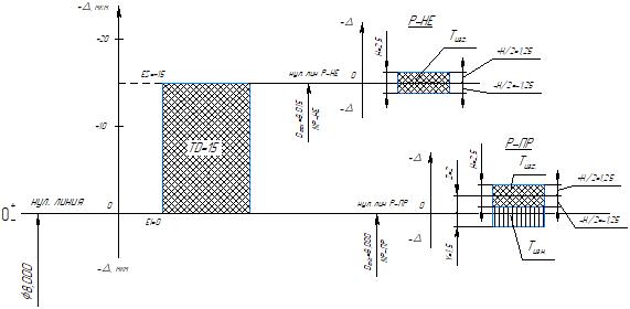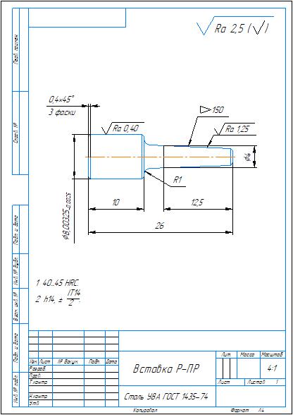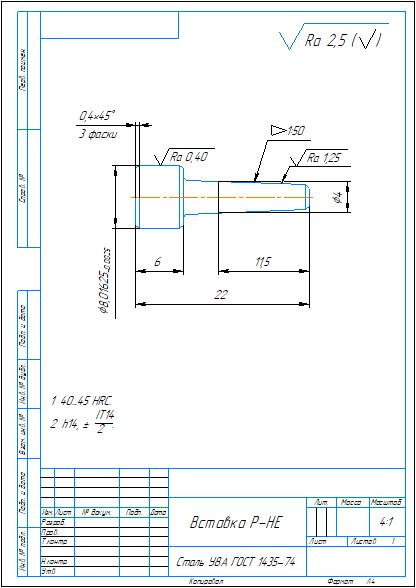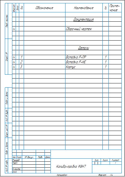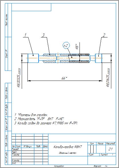 Комплект конструкторской документации на калибр-пробку гладкую для контроля отверстий диаметром 8H7 мм. Приложены: спецификация и сборочный чертеж, рабочий чертежи проходной и непроходной вставок, корпус калибра. Также приложена схема расположения полей допусков при расчете калибра. Чертежи выполнены в компасе.