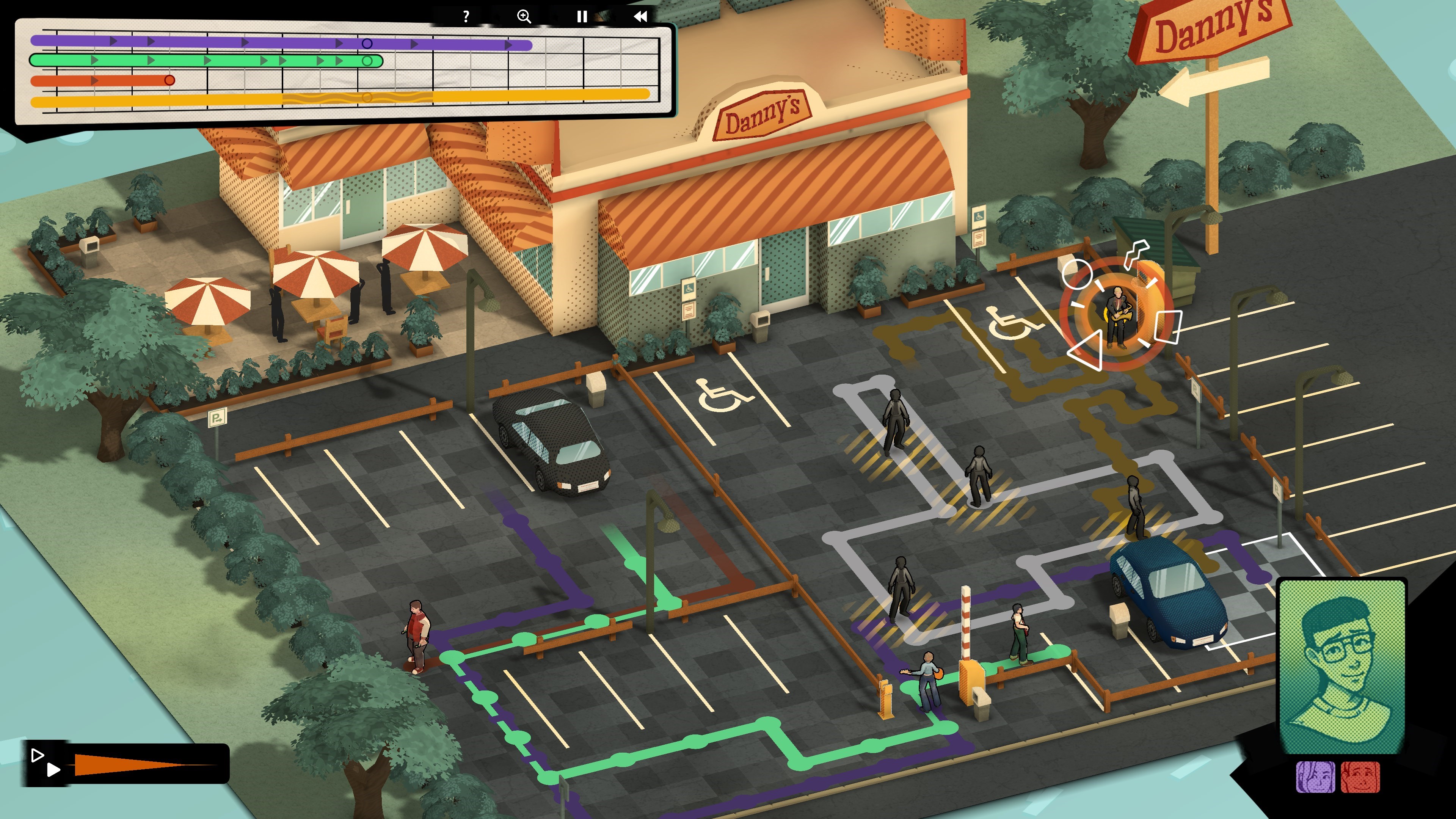 Each character in your band moves through the map in different ways encountering unique solutions and obstacles Advancing a character consumes a turn and part of the timeline setting up interactions with other characters and enemies at different points in time Rewinding a turn undoes your move allowing you to find improved solutions and new ways to tackle problems