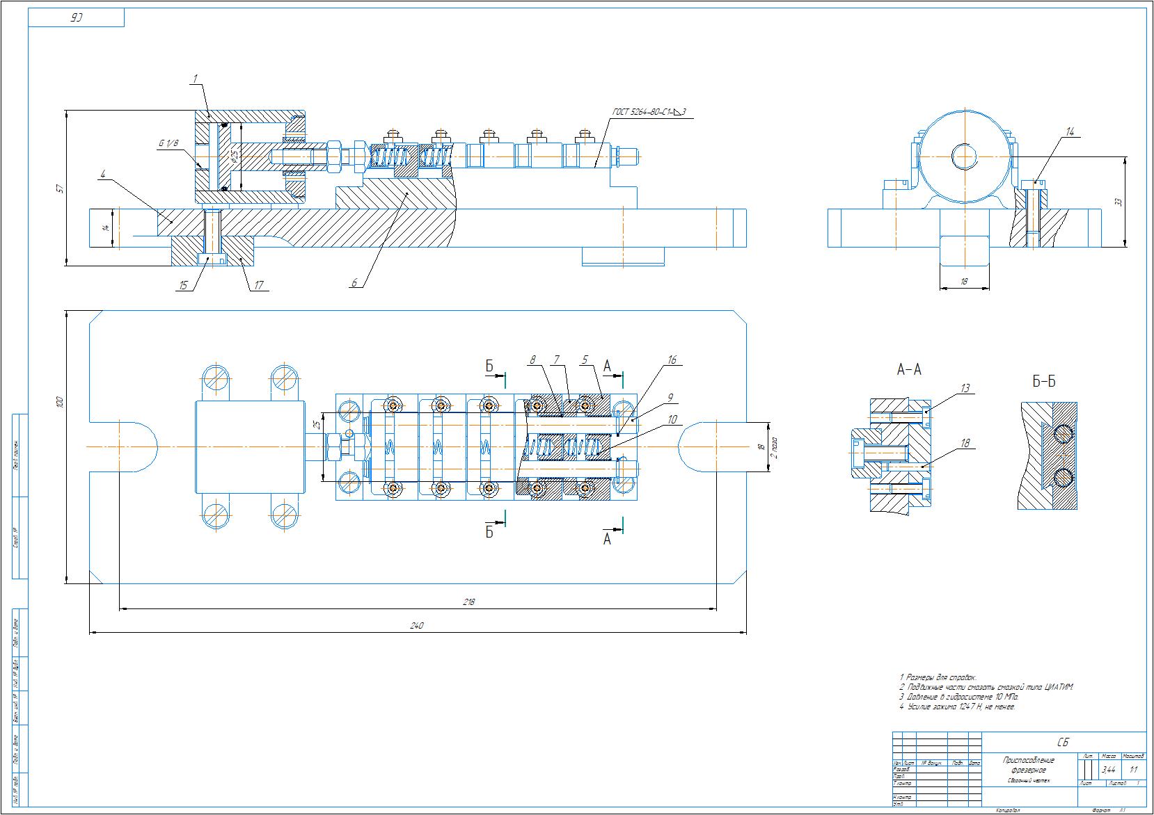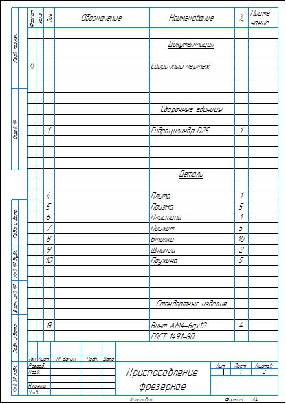 Сборочный чертеж и спецификация фрезерного многоместного приспособления для торцового фрезерования деталей типа цилиндр. Чертеж и спецификация выполнены в компасе.