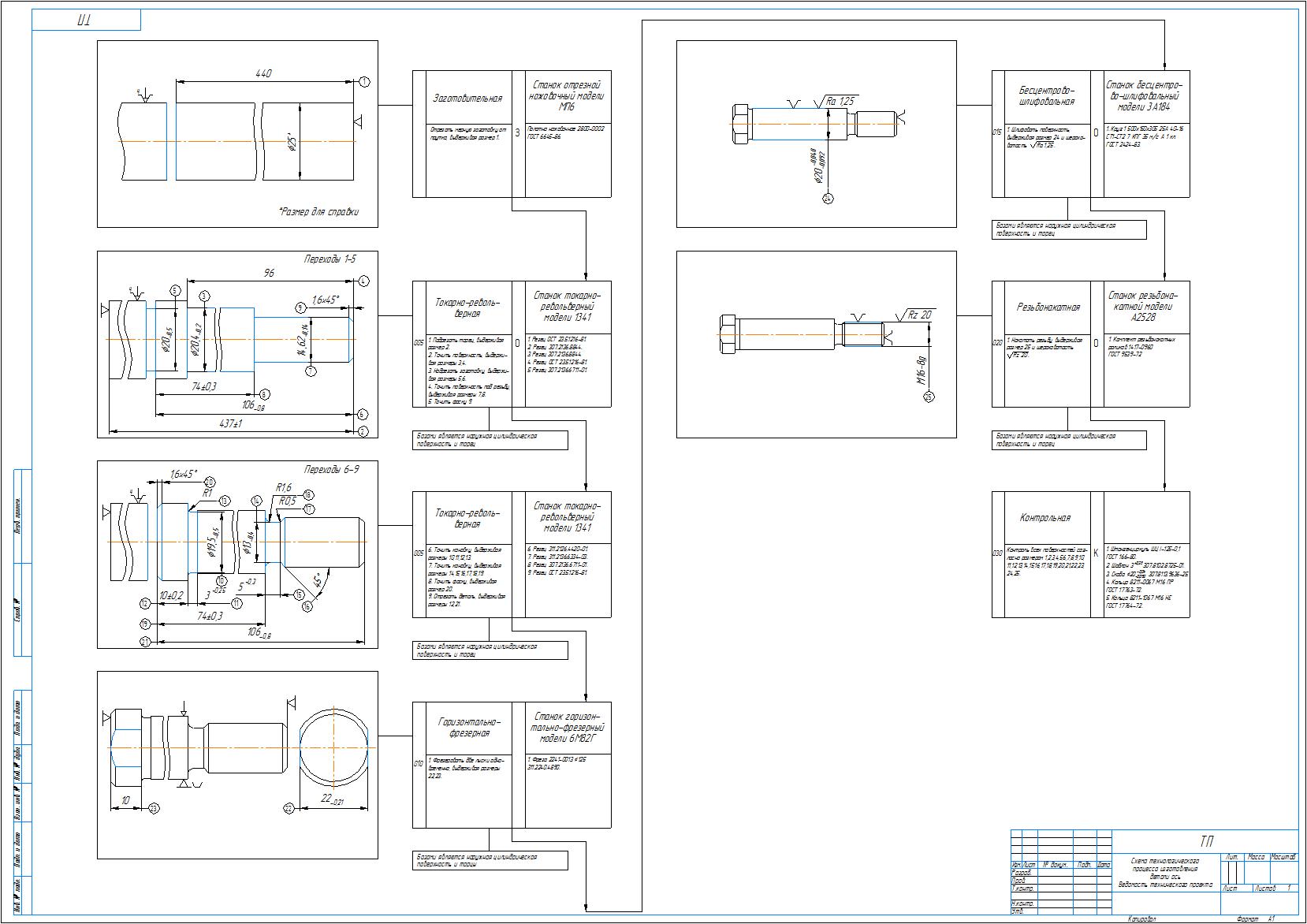 Схема технологического процесса изготовления детали ось на формате А1. На схеме указаны технологические операции, переходы, операционные эскизы, станок, режущий инструмент. Также приложен рабочий чертеж детали ось.
