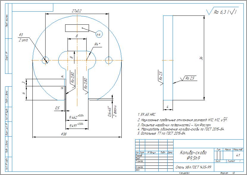 Рабочий чертеж калибра-скобы для контроля размера 9,5h9 в компасе