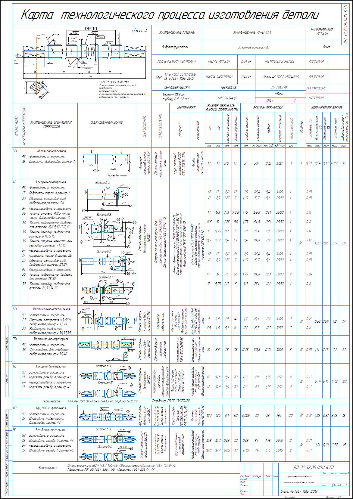 Карта технологического процесса изготовления детали винт в компасе, на формате А1. В карте представлен рабочий чертеж детали винт, операционные эскизы, перечень операций и переходов, оборудование, режущий и измерительный инструменты, режимы резания и нормы времени
