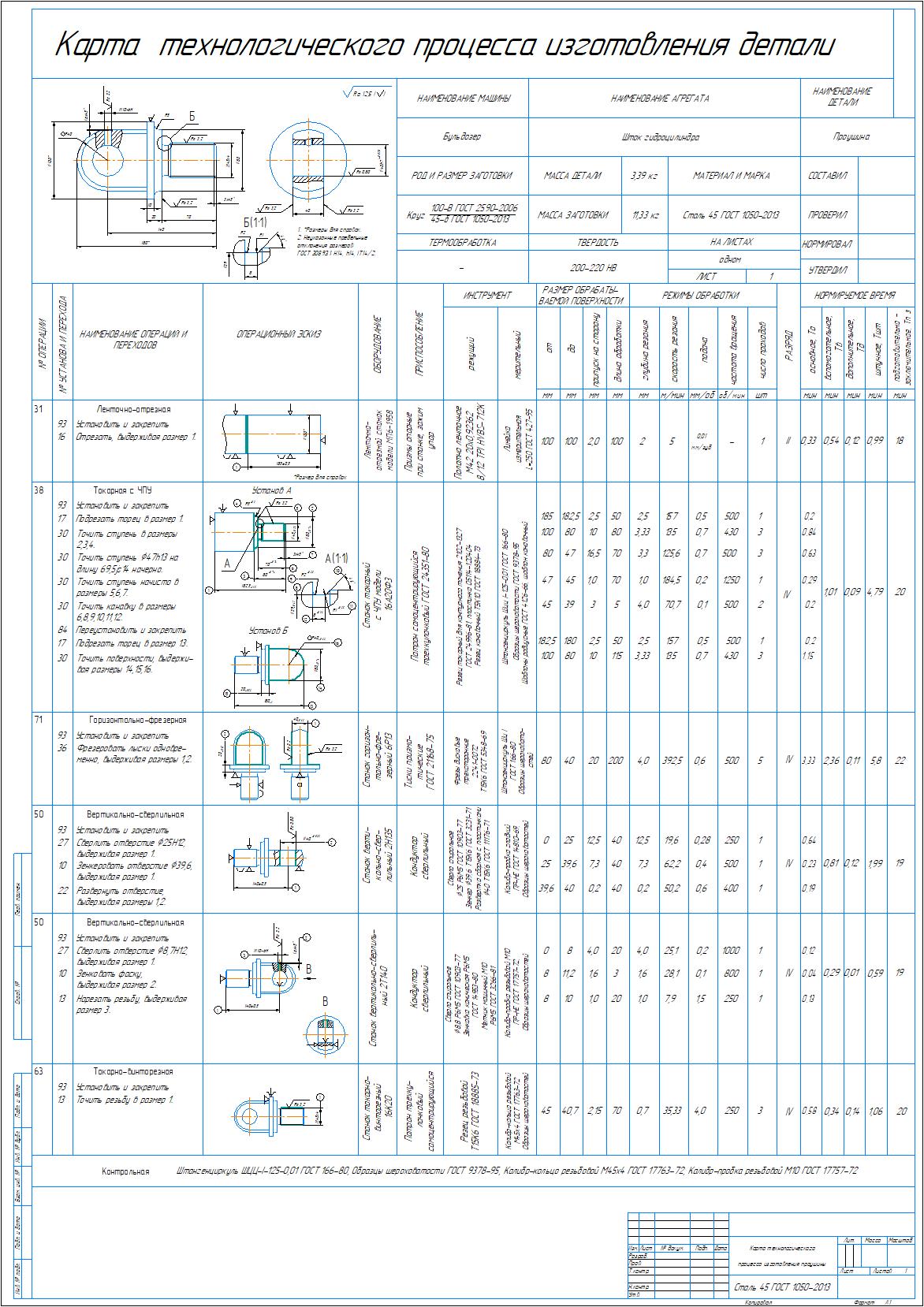 Технологическая карта механической обработки детали проушина в компасе на формате А1. В карте представлены перечень операций, переходов, оборудование, приспособления, режущий и измерительный инструменты, режимы резания и нормы времени, операционные эскизы. Также в карте представлен рабочий чертеж детали проушина.