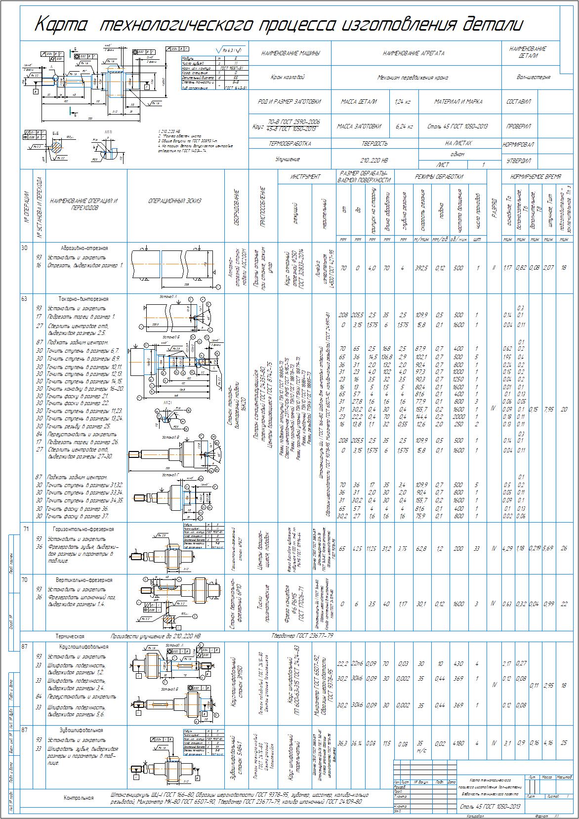 Карта технологического процесса изготовления детали вал-шестерня механизма передвижения крана в компасе, на формате А1. В карте представлены: рабочий чертеж детали вал-шестерня механизма передвижения крана, перечень операций и переходов, оборудование, режущий и измерительный инструменты, режимы резания, нормы времени, операционные эскизы.