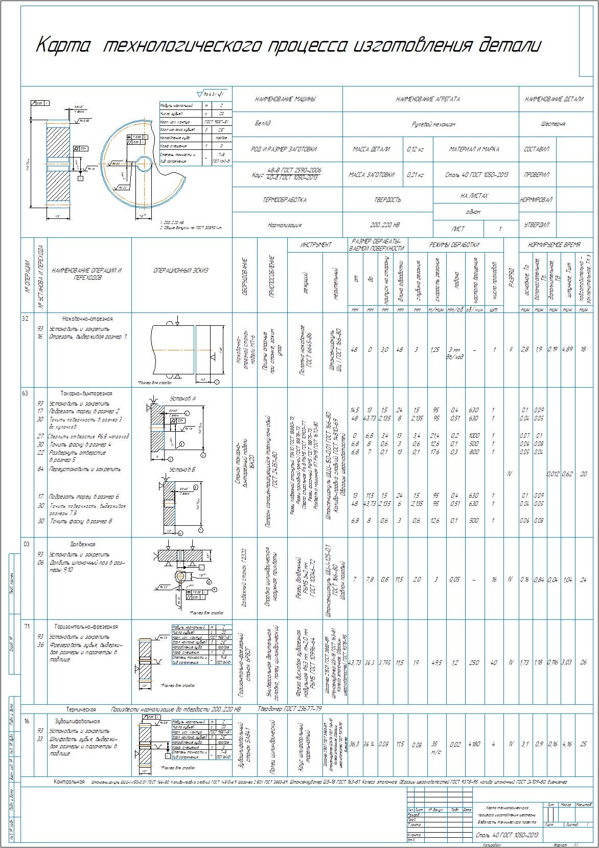 Карта технологического процесса изготовления детали шестерни рулевого механизма в компасе, на формате А1. В карте представлены: рабочий чертеж детали шестерня рулевого механизма, перечень операций и переходов, оборудование, режущий и измерительный инструменты, режимы резания, нормы времени, операционные эскизы.