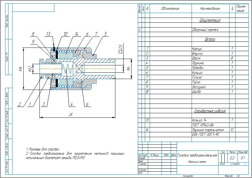 Сборочный чертеж и спецификация головки предохранительной для метчиков. Чертеж выполнен в компасе.