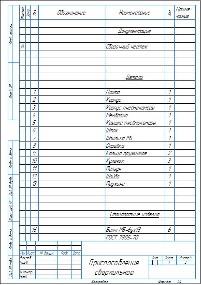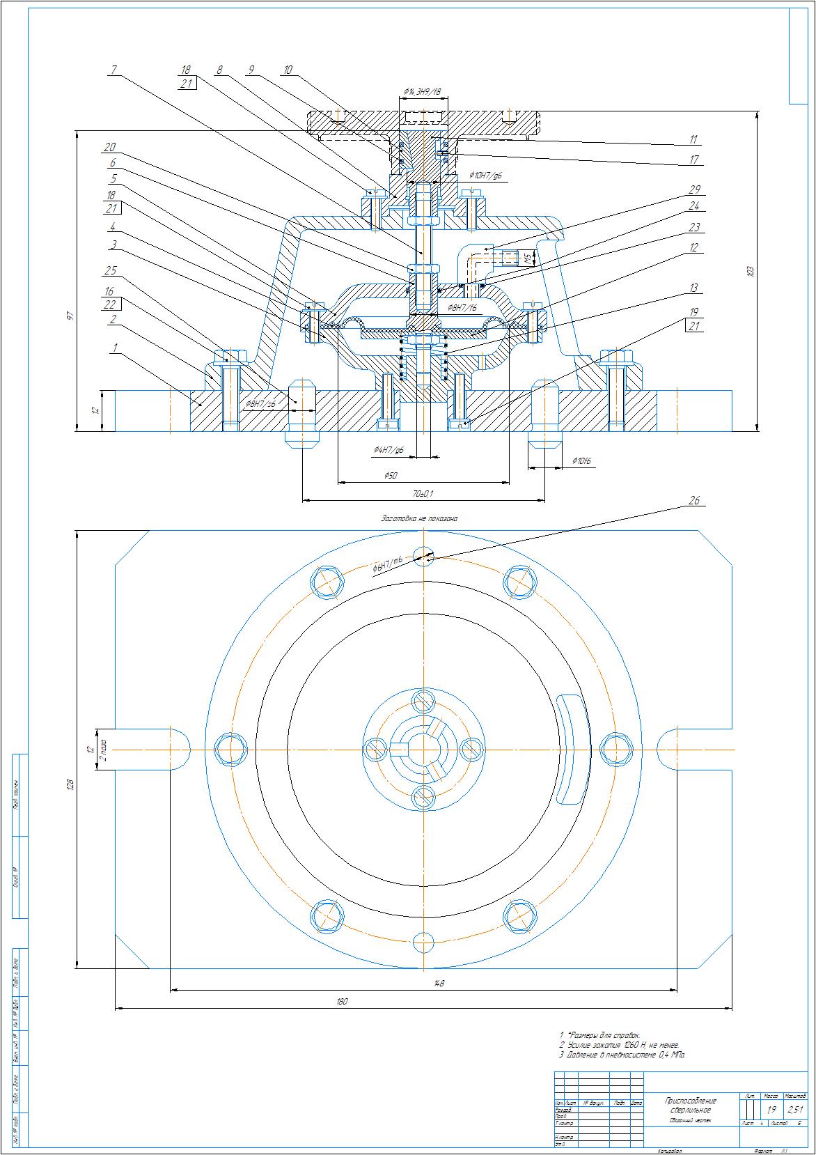 Сборочный чертеж и спецификация сверлильного приспособления с пневматическим приводом и кулачковой оправкой для обработки детали крышка. Также приложен рабочий чертеж детали крышка. Чертежи выполнены в компасе.