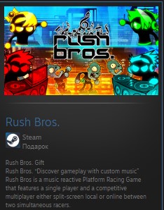 Rush Bros. «Откройте для себя игровой процесс с помощью специальной музыки» Rush Bros — это гоночная игра на платформе, реагирующая на музыку, в которой есть одиночная игра и соревновательный многопользовательский режим с разделенным экраном локально или онлайн между двумя гонщиками одновременно.