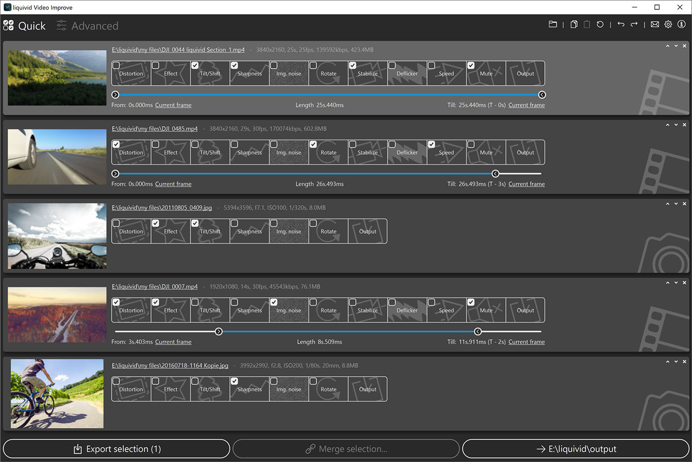 Liquivid Video Improve предлагает множество привлекательных визуальных эффектов, устраняет искажение линзы, вызываемое линзами с широким обзором (как в большинстве экшн-камер), убирает дрожание камеры и шумы изображения, а также улучшает цвет и резкость. Базовая видео нарезка, пакетная обработка и поддержка всех распространенных видео форматов, кодеков и разрешений, делают его излюбленным инструментом всех тех, кто хочет получить из своих фотографий больше.