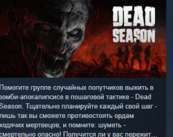 Помогите группе случайных попутчиков выжить в зомби-апокалипсисе в пошаговой тактике - Dead Season. Тщательно планируйте каждый свой шаг - лишь так вы сможете противостоять ордам ходячих мертвецов, и помните: шуметь - смертельно опасно! Получится ли у вас пережить зомби-эпидемию?