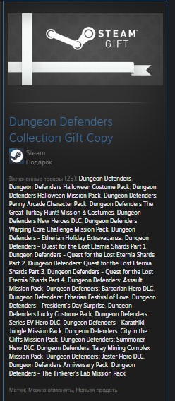 Включенные товары (25): Dungeon Defenders, Dungeon Defenders Halloween Costume Pack, Dungeon Defenders Halloween Mission Pack, Dungeon Defenders: Penny Arcade Character Pack, Dungeon Defenders The Great Turkey Hunt! Mission & Costumes, Dungeon Defenders New Heroes DLC, Dungeon Defenders Warping Core Challenge Mission Pack, Dungeon Defenders - Etherian Holiday Extravaganza, Dungeon Defenders - Quest for the Lost Eternia Shards Part 1, Dungeon Defenders - Quest for the Lost Eternia Shards Part 2, Dungeon Defenders: Quest for the Lost Eternia Shards Part 3, Dungeon Defenders - Quest for the Lost Eternia Shards Part 4, Dungeon Defenders: Assault Mission Pack, Dungeon Defenders: Barbarian Hero DLC, Dungeon Defenders: Etherian Festival of Love, Dungeon Defenders - President´s Day Surprise, Dungeon Defenders Lucky Costume Pack, Dungeon Defenders: Series EV Hero DLC, Dungeon Defenders - Karathiki Jungle Mission Pack, Dungeon Defenders: City in the Cliffs Mission Pack, Dungeon Defenders: Summoner Hero DLC, Dungeon Defenders: Talay Mining Complex Mission Pack, Dungeon Defenders: Jester Hero DLC, Dungeon Defenders Anniversary Pack, Dungeon Defenders - The Tinkerer´s Lab Mission Pack
