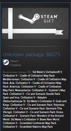 Включенные товары (16): Sid Meier´s Civilization® V, Civilization V - Cradle of Civilization Map Pack: Mediterranean, Civilization V - Cradle of Civilization Map Pack: Asia, Civilization V - Cradle of Civilization Map Pack: Americas, Civilization V - Cradle of Civilization Map Pack: Mesopotamia, Civilization V - Explorer’s Map Pack, Civilization V - Civ and Scenario Double Pack: Spain and Inca, Civilization V - Babylon (Nebuchadnezzar II), Sid Meier´s Civilization V: Gods and Kings, Civilization V - Civ and Scenario Pack: Polynesia, Civilization V - Civ and Scenario Pack: Denmark (The Vikings), Civilization V - Civ and Scenario Pack: Korea, Civilization V - Scenario Pack: Wonders of the Ancient World, Sid Meier´s Civilization V: Brave New World, Civilization V - Scrambled Continents Map Pack, Civilization V - Scrambled Nations Map Pack