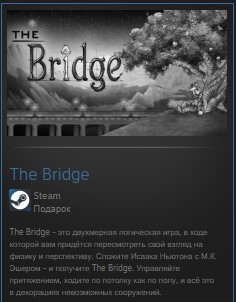 The Bridge - это двухмерная логическая игра, в ходе которой вам придётся пересмотреть свой взгляд на физику и перспективу. Сложите Исаака Ньютона с М.К. Эшером - и получите The Bridge. Управляйте притяжением, ходите по потолку как по полу, и всё это в декорациях невозможных сооружений.