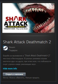 "Shark Attack Deathmatch 2" пробуждает азарт в подводном хаосе как ни одна другая игра. Борьба за выживание будет жестокой и беспощадной. В разных режимах игроки охотятся друг на друга, при этом зная, что поблизости снует угроза в виде ужасающих акул. Разрывайте водолазов на части, примерив на себя роль самого опасного водного хищника – большой белой акулы.