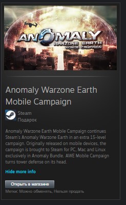 Мобильная кампания Anomaly Warzone Earth продолжает 15-уровневую кампанию Steam Anomaly Warzone Earth. Первоначально она была выпущена для мобильных устройств, но теперь доступна в Steam для ПК, Mac и Linux исключительно в комплекте Anomaly.