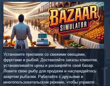 Установите прилавки со свежими овощами, фруктами и рыбой. Доставляйте заказы клиентов, устанавливайте цены и расширяйте свой базар. Ловите свою рыбу для продажи и наслаждайтесь азартом рыбалки. Работайте с друзьями в многопользовательском режиме, чтобы управлять базаром вместе.