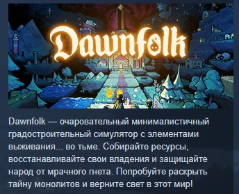 Dawnfolk — очаровательный минималистичный градостроительный симулятор с элементами выживания... во тьме. Собирайте ресурсы, восстанавливайте свои владения и защищайте народ от мрачного гнета. Попробуйте раскрыть тайну монолитов и верните свет в этот мир!