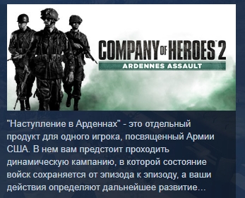 “Company of Heroes 2: Наступление в Арденнах” - это самостоятельный продукт, позволяющий ознакомиться с Армией США в 18 сценариях для одного игрока. Чтобы получить доступ к этой армии, приобретите ее отдельно или в составе комплекта "Армии Западного фронта".