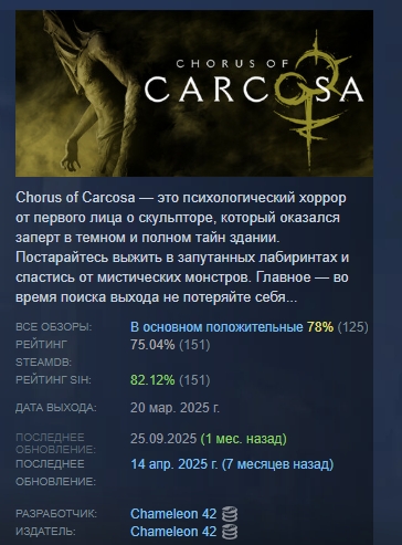 Chorus of Carcosa — это психологический хоррор от первого лица о скульпторе, который оказался заперт в темном и полном тайн здании. Постарайтесь выжить в запутанных лабиринтах и спастись от мистических монстров. Главное — во время поиска выхода не потеряйте себя...