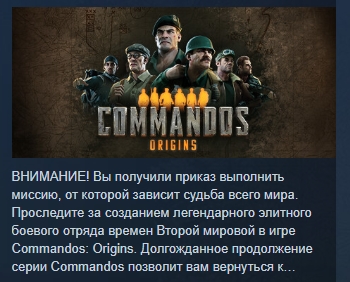 ВНИМАНИЕ! Вы получили приказ выполнить миссию, от которой зависит судьба всего мира. Проследите за созданием легендарного элитного боевого отряда времен Второй мировой в игре Commandos: Origins. Долгожданное продолжение серии Commandos позволит вам вернуться к основам жанра «тактика в реальном времени». Это времена, когда зеленый берет Джек О´Хара и пятеро его спутников создали отряд, выполнявший сложнейшие задачи, которые были не по зубам всем остальным.