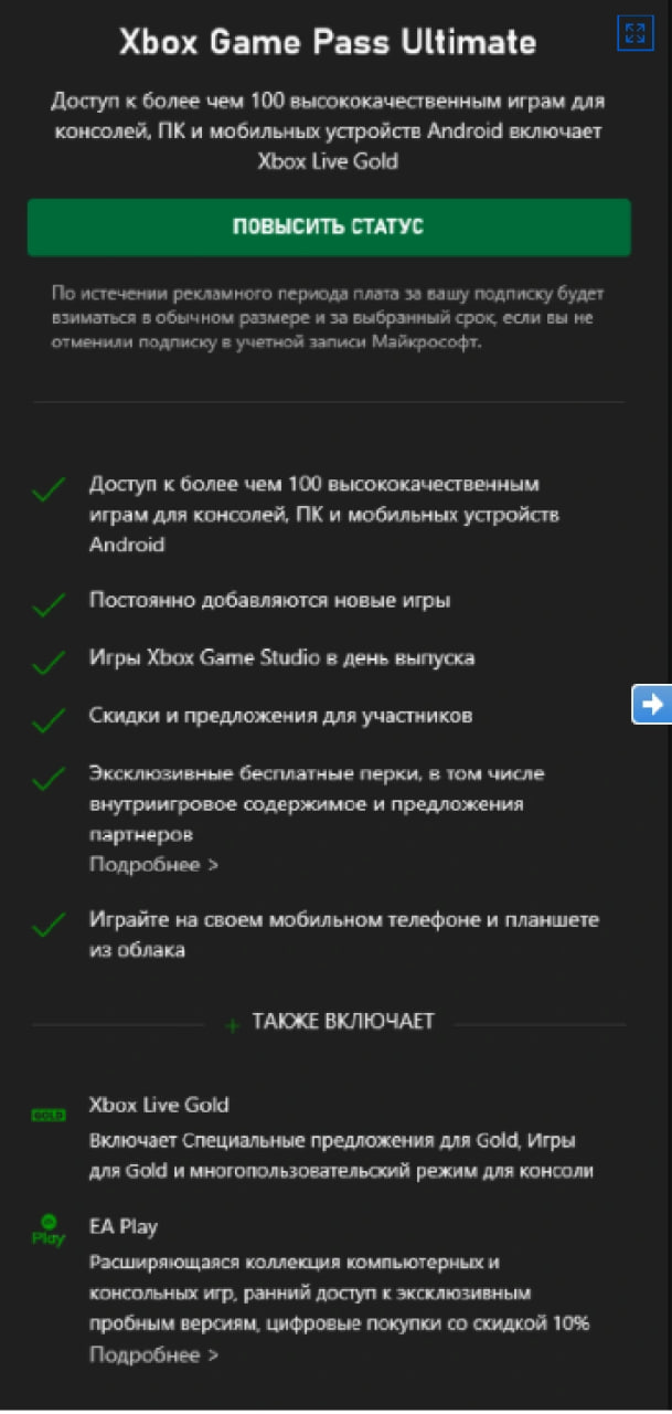 Xbox Game Pass Ultimate включает все преимущества Xbox Live Gold, а также более 100 высококачественных игр для консолей и ПК. Новые игры добавляются постоянно, поэтому всегда есть что поиграть. Наслаждайтесь эксклюзивными предложениями и скидками для участников, играйте с друзьями в самой продвинутой многопользовательской сети и откройте для себя свою следующую любимую игру.